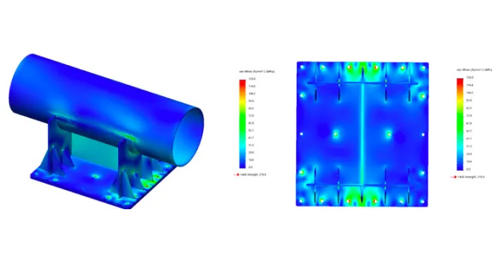 Our engineering team conducts static finite element analysis (FEA) to optimize support geometries in relation to the applied loads. We also perform thermal simulations to assess the risk of condensation and its potential impact on surrounding structures and components. These analyses enable us to deliver safe, reliable, and efficient support designs, particularly in thermally sensitive environments.